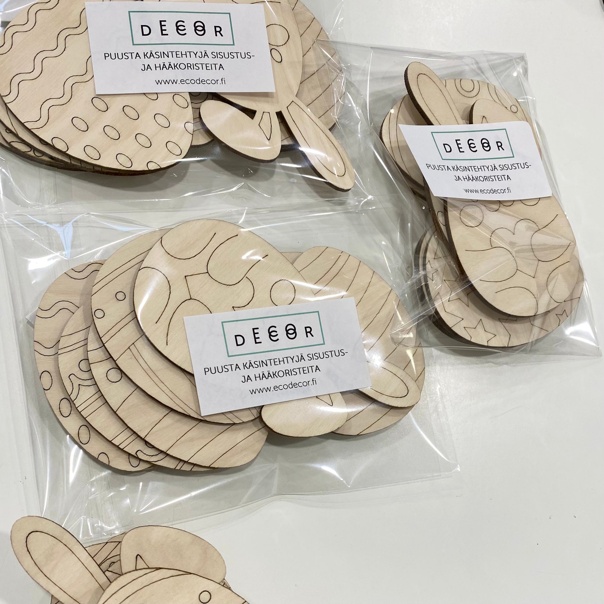 The set includes 9 Easter eggs with double-sided tape. The engravings are different on all the ornaments. Made of local birch plywood in Helsinki.
