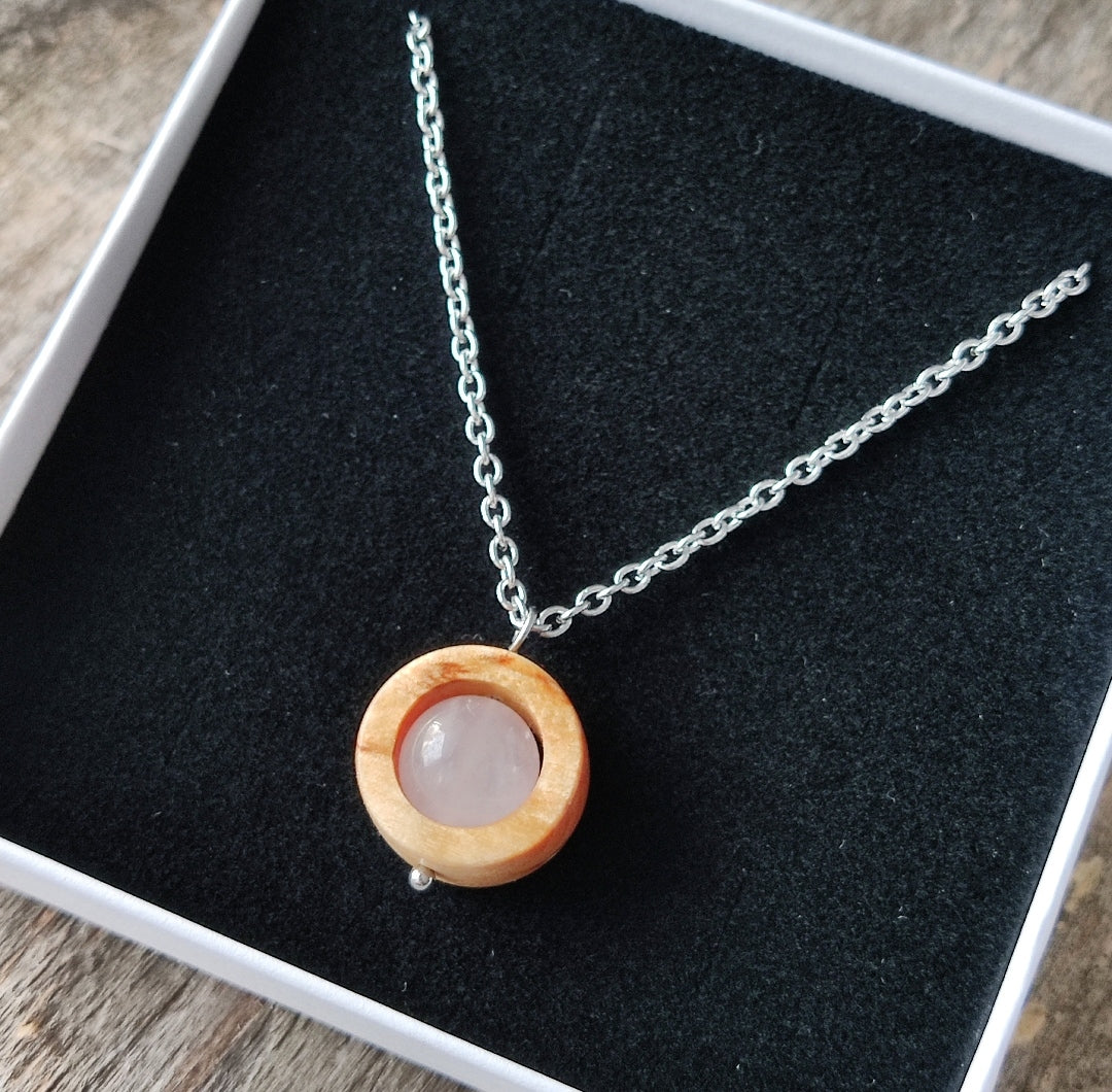 Ringhalsband med hänge av inhemsk björk med rosékvartspärla.