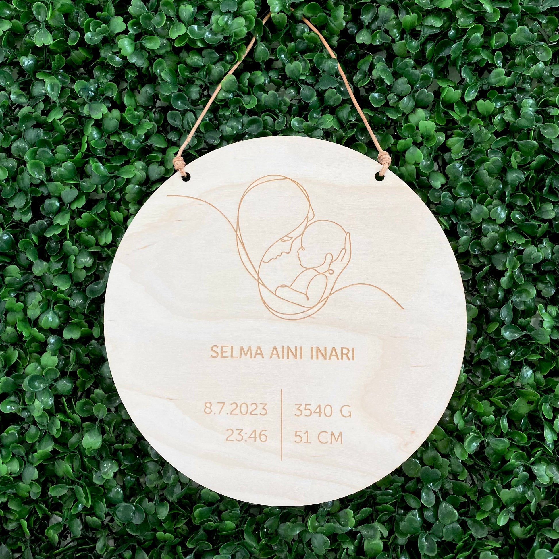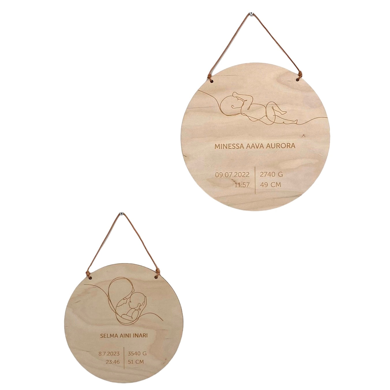Födelsebrädan finns i två olika storlekar: med en diameter på 20 cm eller 25 cm. Brädan fästs på väggen med ett elegant lädersnöre.