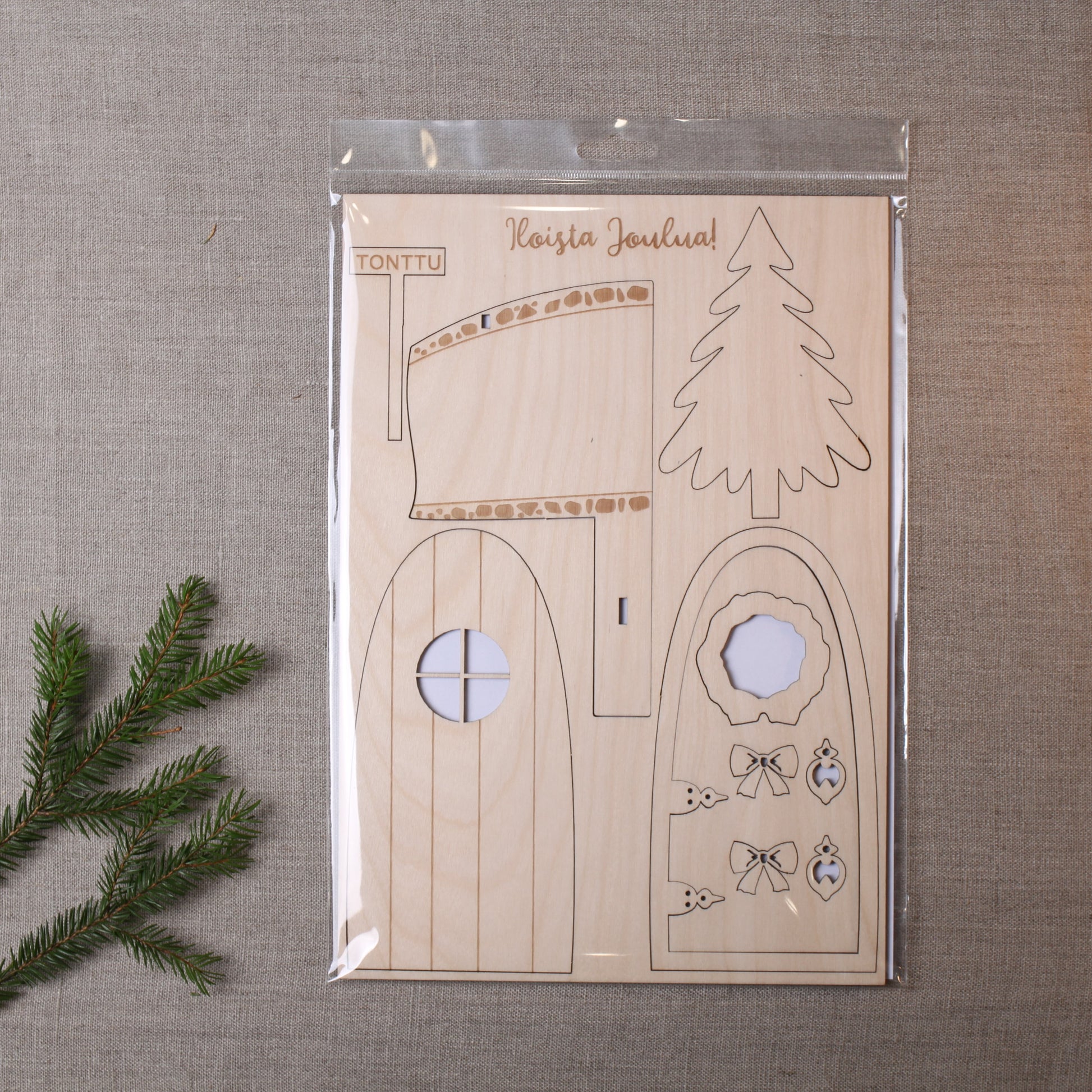 Tomtedörrkarmen, kransen, bågen och dörrhandtaget limmas ihop. En väg ingår också, där skylten och granen ska fästas.