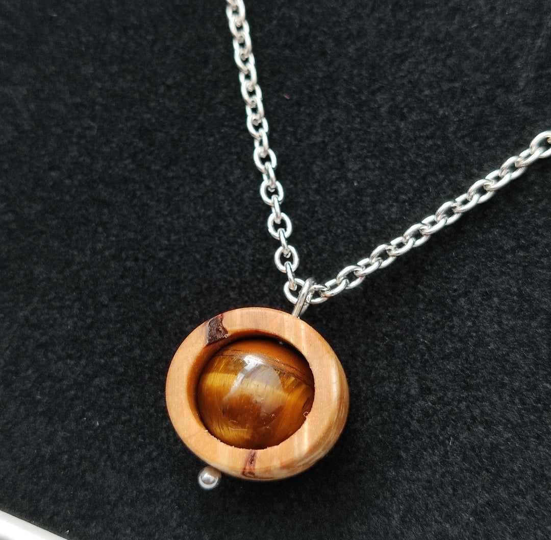 Kehä-kaulakoru, jossa kotimaisesta visakoivusta valmistettu riipus tiikerinsilmähelmellä.