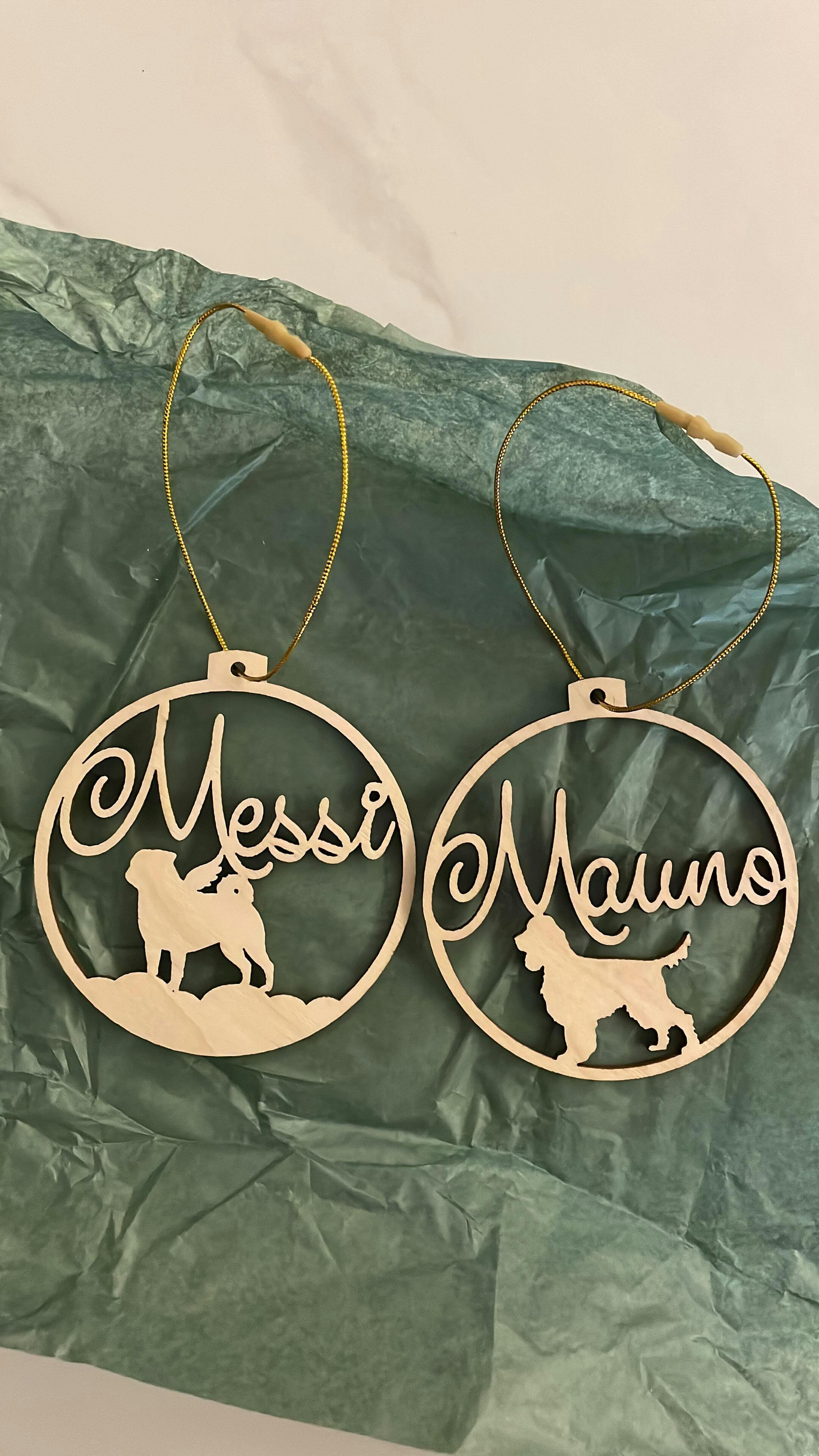 Jokainen koira ansaitsee paikkansa kuusen oksalla. Tämä joulupallo on täydellinen tapa muistaa rakasta edesmennyttä koiraa. Koiran siluettiin lisätään siivet ja voit myös halutessasi lisätä koiran alapuolelle pienen, pari sanaa pitkän, toivotuksen.