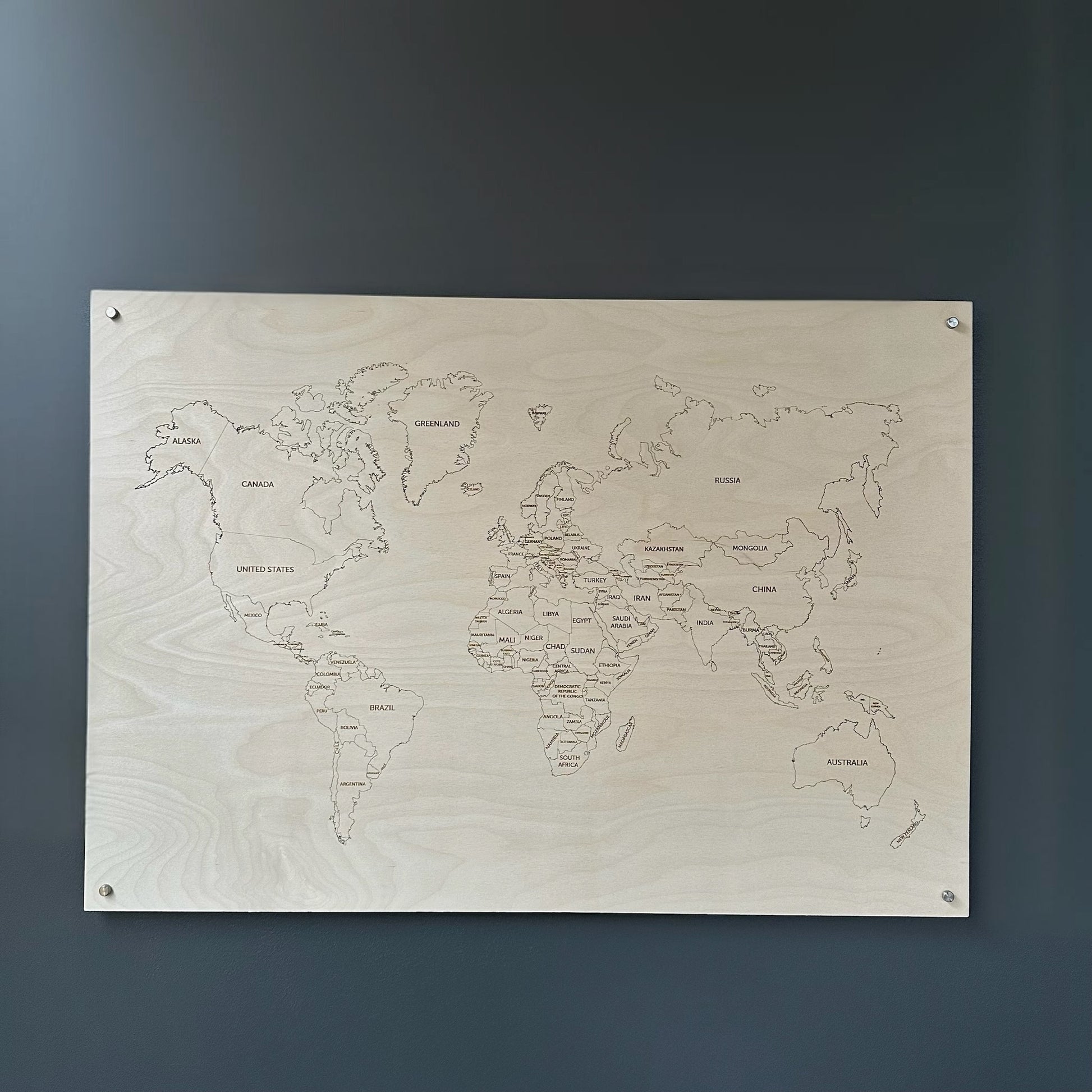 Maailmankarttamme luo ainutlaatuisen kodikkaan ja lämpimän tunnelman sekä korostaa hyvää makua ja huolenpitoa ympäristöstä. Luonnollinen puu tuo lämpöä ja viihtyisyyttä, täyttää tilan luonnonenergialla ja tekee sisustuksesta elävän ja "hengittävän". Kartta sopii harmonisesti kotiin, esimerkiksi olohuoneeseen, makuuhuoneeseen, keittiöön tai eteiseen. Tämä sopii myös hyvin toimistotiloihin, studioihin, coworking-tiloihin ja neuvotteluhuoneisiin. Se on tyylikäs sisustuselementti yrityksille, jotka arvostavat luonnonmateriaaleja ja modernia muotoilua.