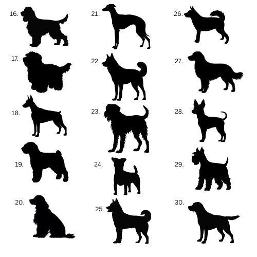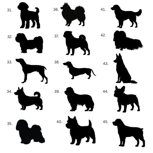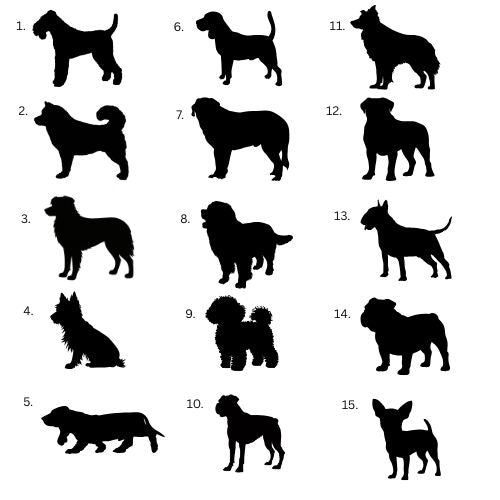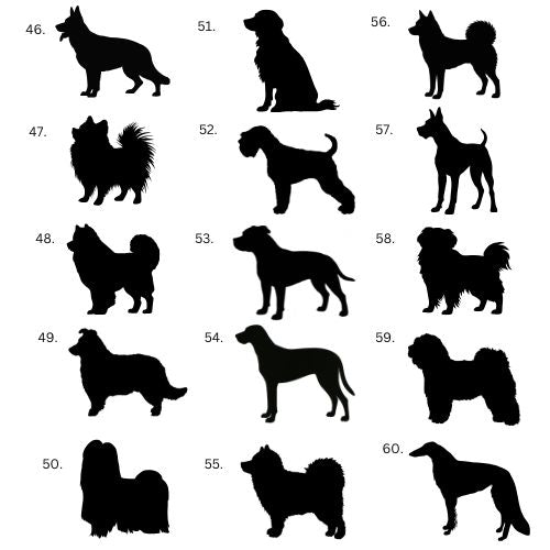Om din hunds ras inte finns på listan eller om din hund är blandras, gör vi en siluett direkt från en bild på din hund. Välj "Annat" från listan och skicka oss en bild via e-post.