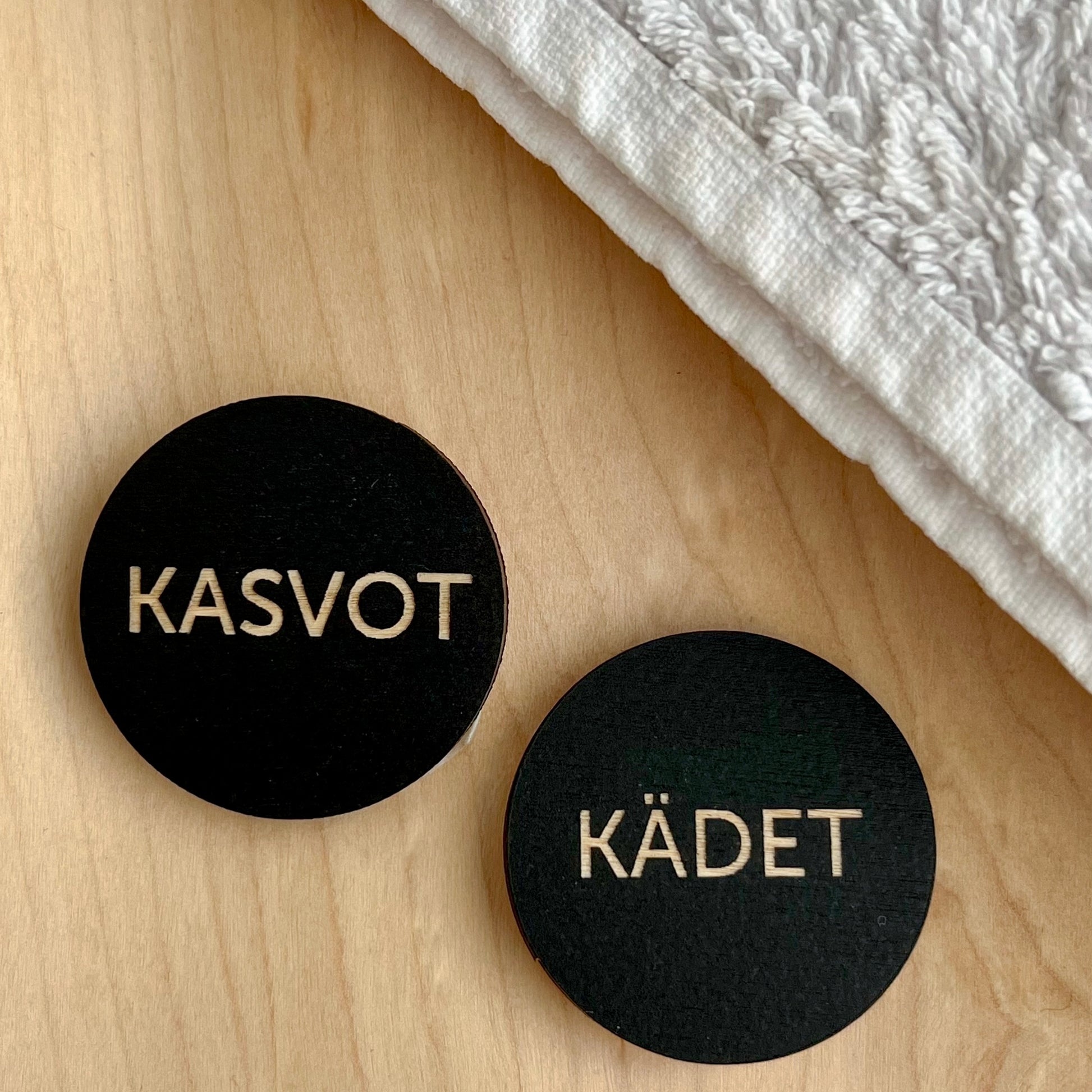 Mått på handduken: diameter 4 cm. Etiketterna är gjorda av inhemsk björkfaner i Helsingfors.