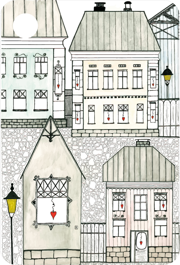 Bilden på skärbrädan är baserad på en handritad markörteckning av gamla finska hus.